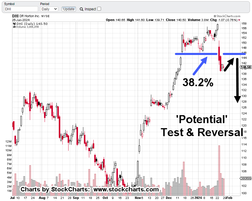 D.R., Horton (DHI) has retraced about 38% of its move and is testing the underside of breakdown resistance.