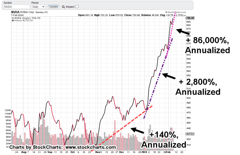 As we’ll see in the chart below, NVDA appears to be in a blow-off top with ever-increasing rates of ascent.