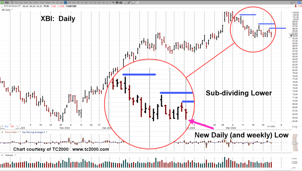 Instead, shown below, each bounce has less energy and, in the pre-market, XBI is trading lower.