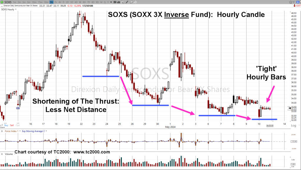 What we’re highlighting here on the hourly, is net distance traveled on the down move (upward in SOXX), getting shorter with each successive thrust.