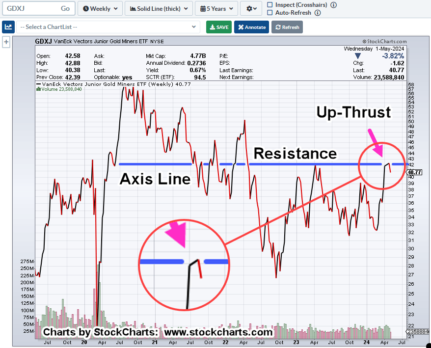 “A reasonable expectation is NEM, retraces, testing the wide bar and volume before continuing to the downside or moving back higher to a breakout.”