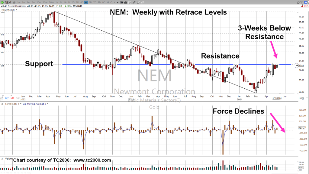 Gold’s near all-time highs, silver’s rebounded, testing recent highs; yet Newmont’s at a paltry 23.6%, retrace.