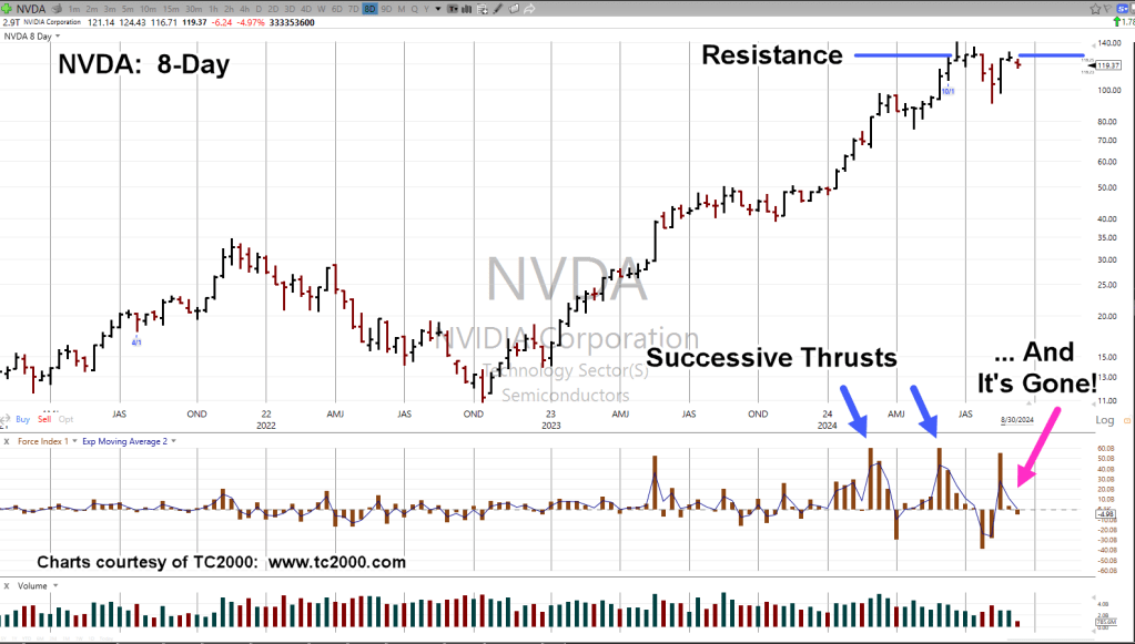 The prior two price action thrusts had numerous (positive) ‘8-Day’ Force Index segments after that initial thrust.