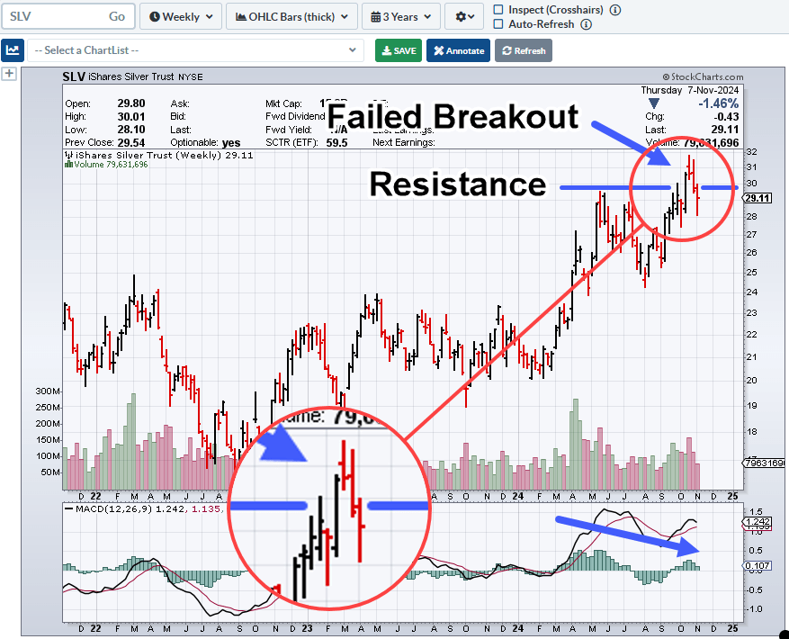 When looking at the SLV, chart, the bearish case continues to build (not advice, not a recommendation).
