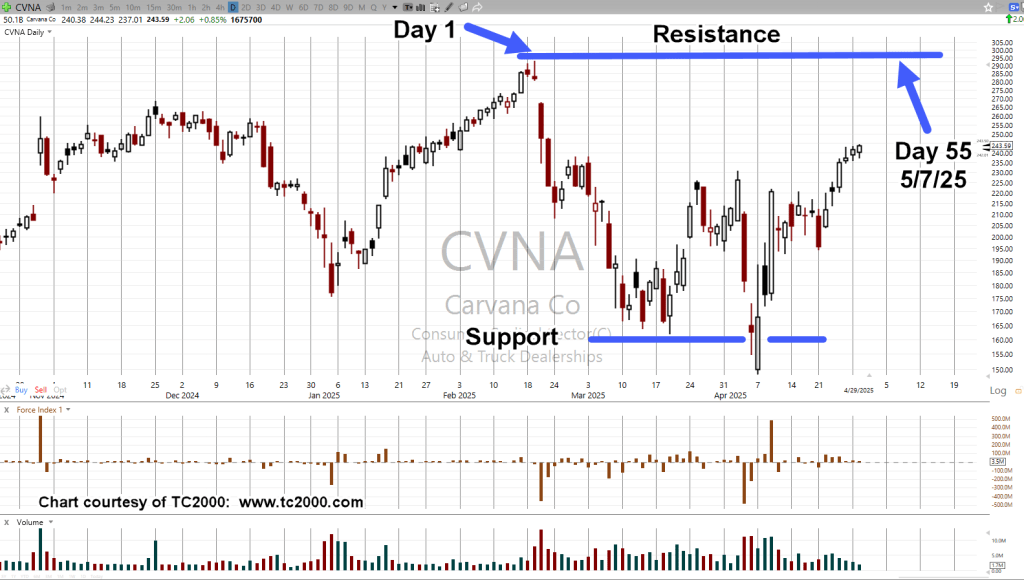Also note, Carvana has dropped from the current resistance area (around 240) making that level the more probable area for an up-thrust, rather than yesterday’s 310-location (not advice, not a recommendation).