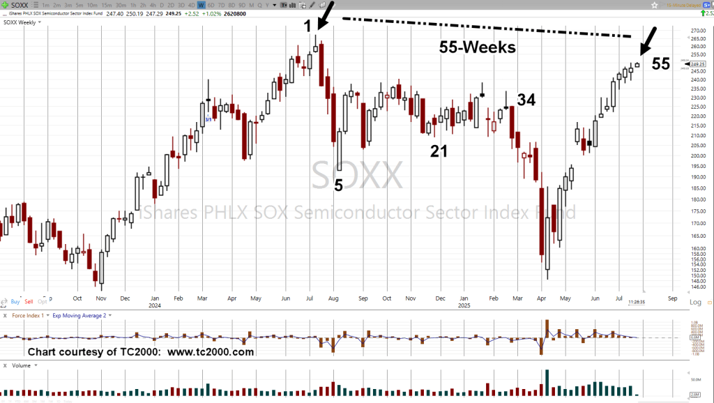 We also know, shown on the weekly chart, we’re at Fibonacci Week 55, from the all-time highs.