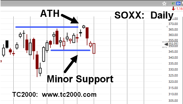The price segment at left, shows the SOXX reversing from all-time highs, lower into minor support, then retrace.