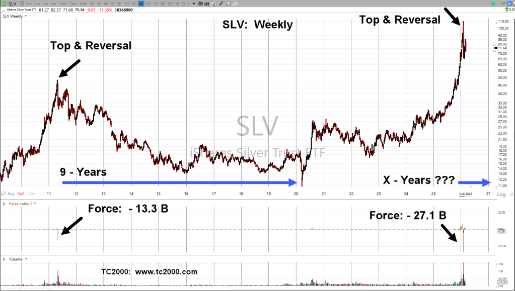 Putting aside the YouTube ‘silver to the moon’ hype, ‘dollar destruction’, and ‘economic collapse’ narratives, along with every other form of hysteria or mania du jour, we’re going to try something novel; like just looking at the chart of silver (SLV), itself.