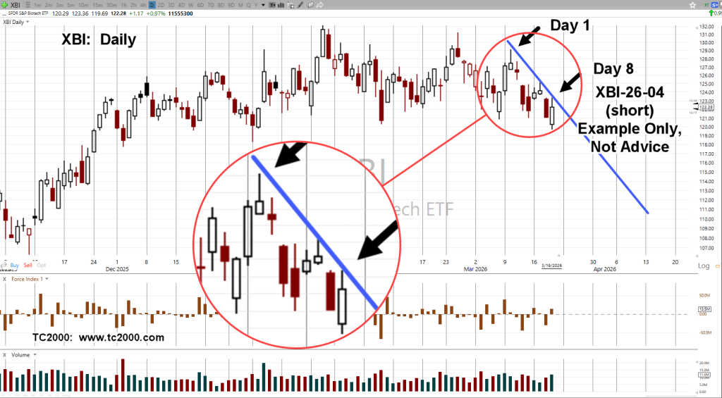 For the short position, XBI-26-04. shown, the stop is just above today’s session high (not advice, not a recommendation).