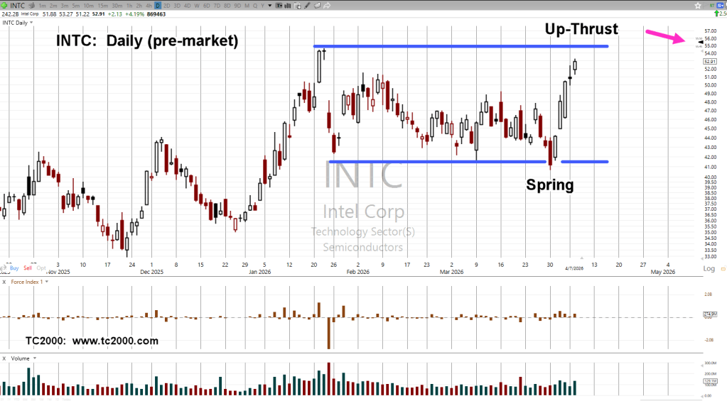 If intel (INTC) opens at the level shown (magenta arrow), it’s going to post a new daily high, above January 22nd high.