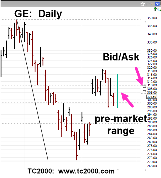 GE just released earnings and has been trading in an 18-point range (green bar) in the pre-market.