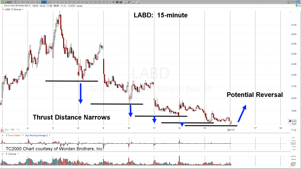 Note for the inverse fund, the ‘spring’ on SPBIO, becomes the ‘up-thrust’ on LABD.