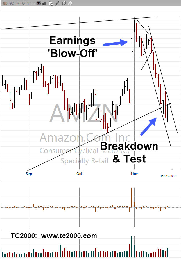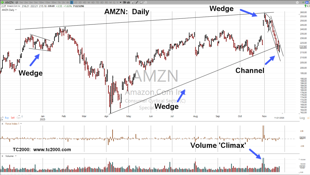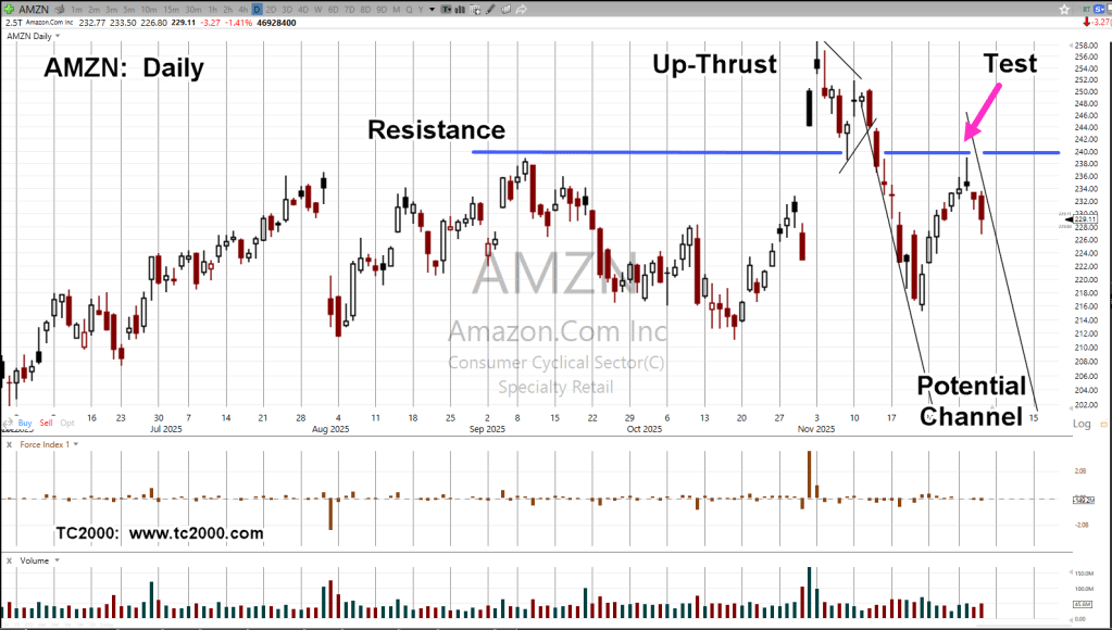 From the lows of October 17th to Friday’s close AMZN is only up 8.77% and appears to be in a downward channel (not advice, not a recommendation).