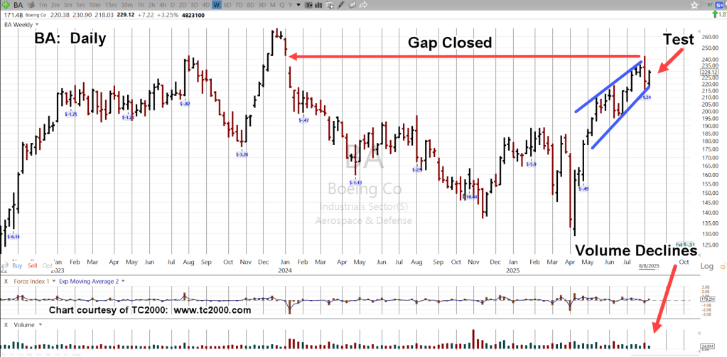 The sidebar shows already short BA, as trade BA-25-01, with stop at today’s final high or last Friday’s high, whichever comes first (not advice, not a recommendation).