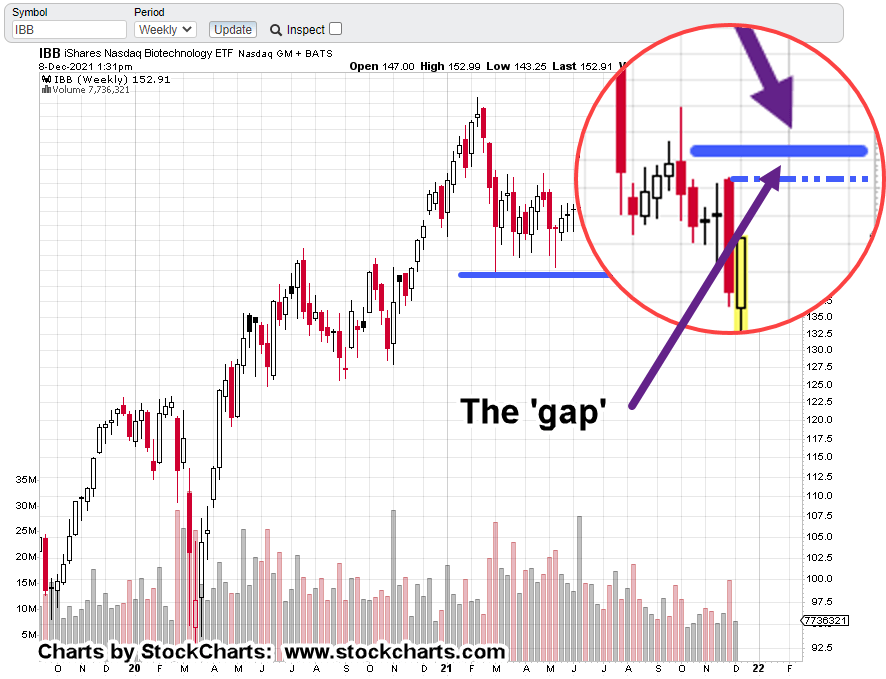 If price action makes it past the resistance bars and into the gap, IBB would then be in up-thrust position (not advice, not a recommendation).