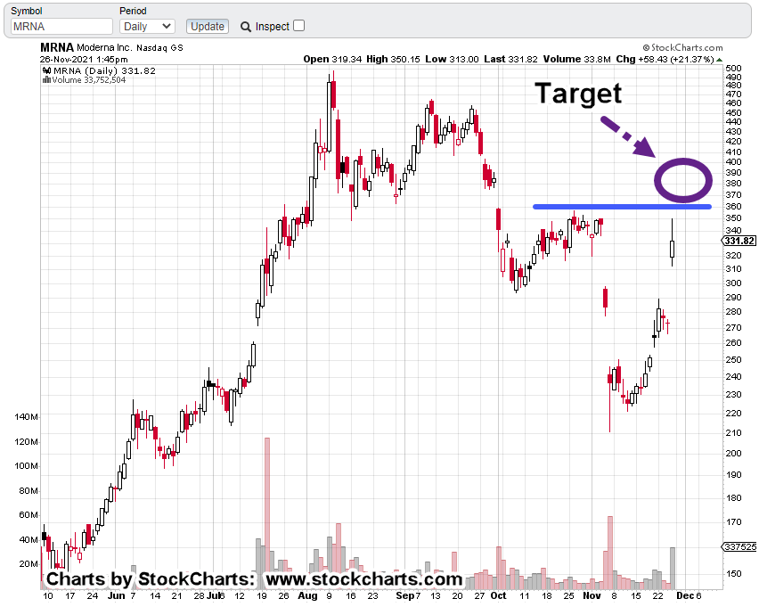 In addition, we have Moderna (MRNA) in the process of penetrating the trendline shown in yesterday’s update. If price action continues lower (as it’s doing in the early session), it could be on track to post a weekly reversal.