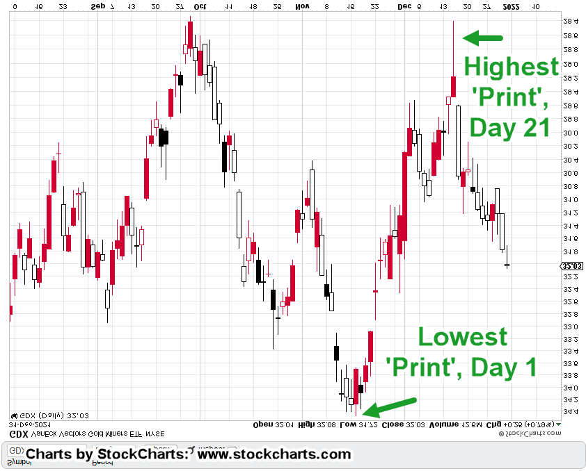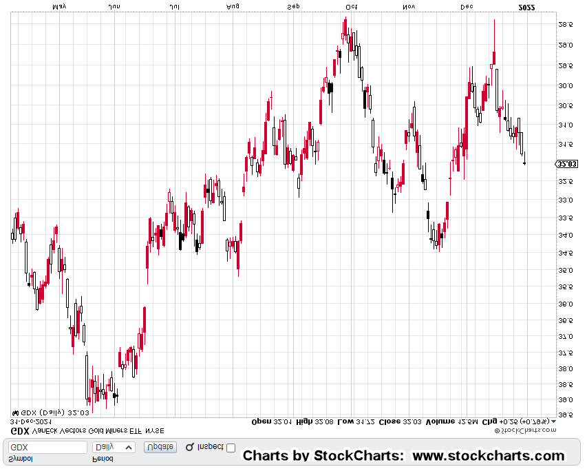 We’ll start with the un-market daily chart of GDX and then invert (to approximate DUST) for the subsequent analysis.