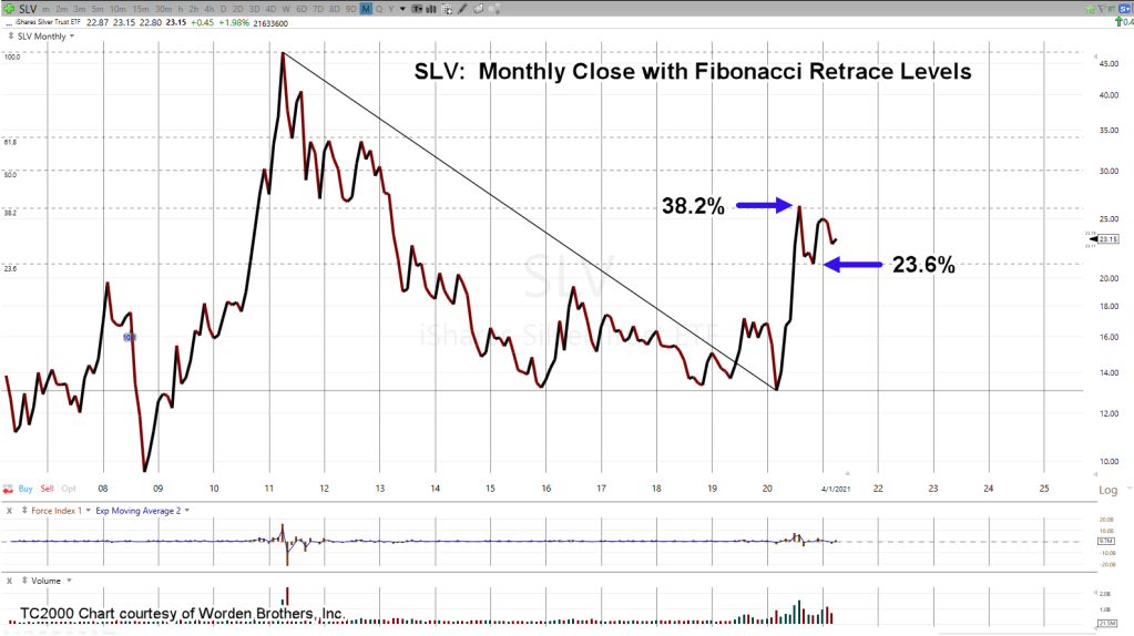 On a monthly closing basis, SLV has pivoted (down) off the 38.2% Fibonacci retrace level when looking at the entire decline from April 2011, to march 2020.