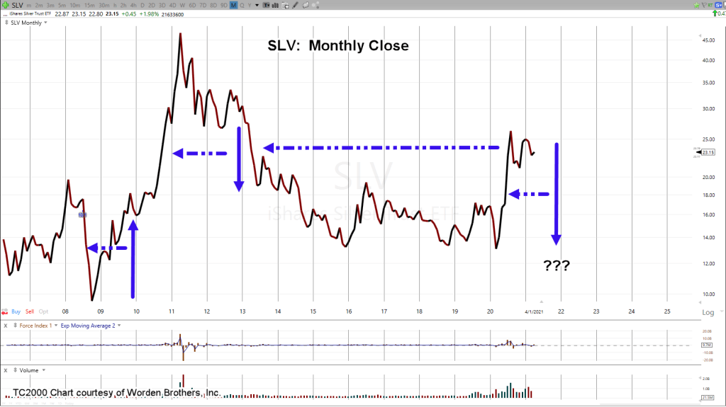 Now, let’s look at the monthly close of silver (SLV):