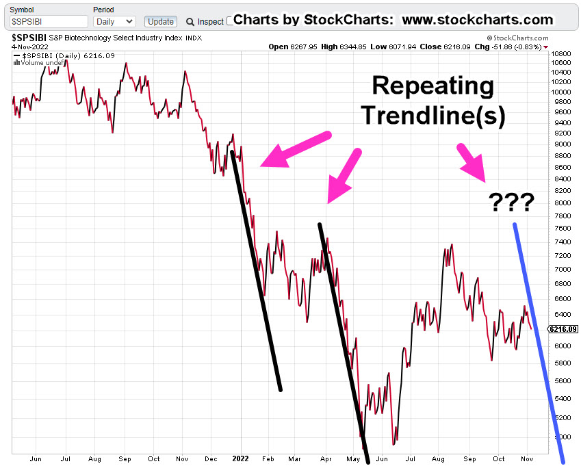 Meanwhile, back at the ranch, biotech sector (SPBIO) is still on track (ever so slowly) for a potential sustained move to the downside (not advice, not a recommendation).