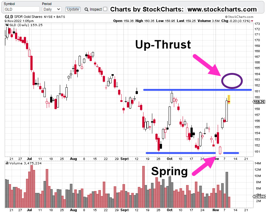 Let’s take a look at gold (GLD) and how I used its message to position short (not advice, not a recommendation).