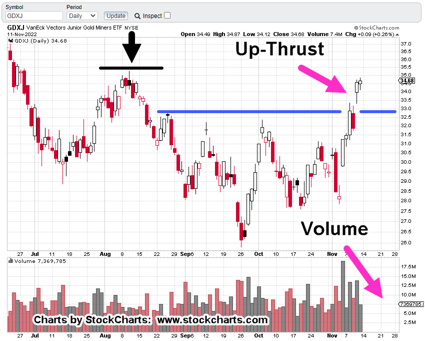 Seniors, GDX, was able to penetrate this area on its own chart but GDXJ, has not (so far).