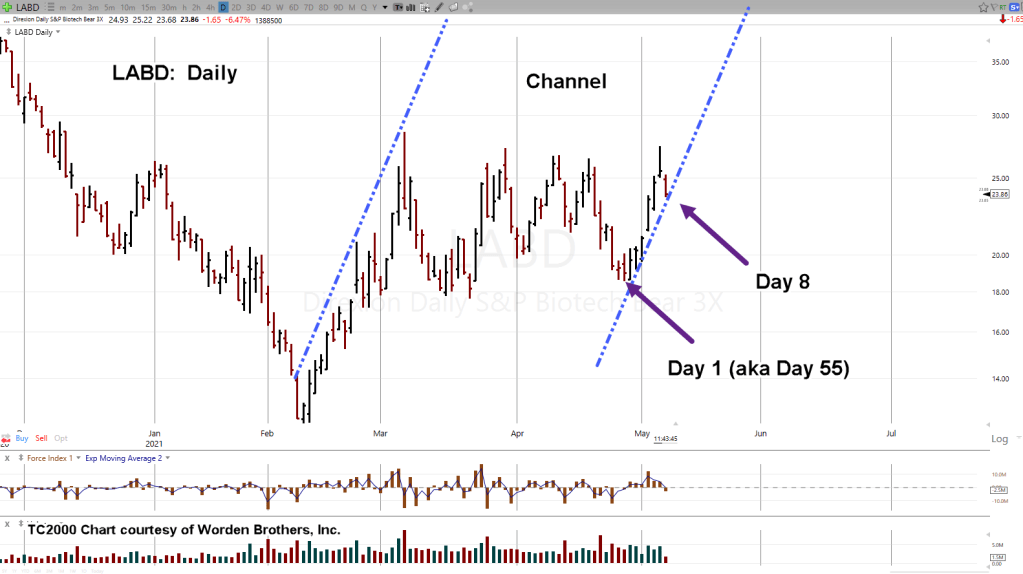 If there’s an upward (LABD) reversal from here, a Fibonacci Day 8, from the original Day 55 low, it would give more confirmation we’re at least following the trendline; potentially at the very right side of a huge trading range.