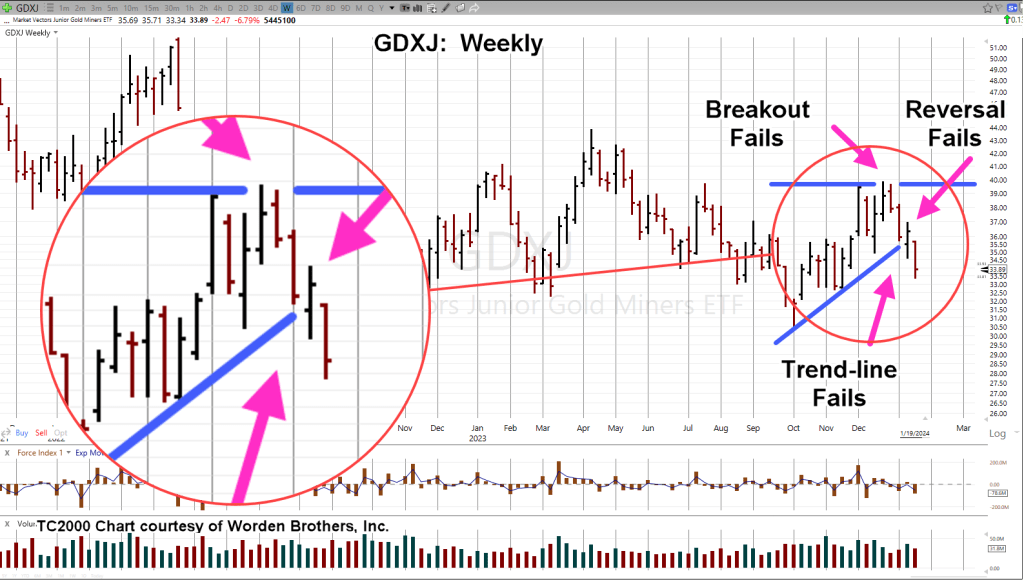These reports, here and here, posted back in April, identified reversals in gold miners GDXJ, and implicitly GDX, to the day.