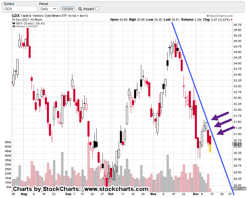 The chart below has SLV, penetrating one support level (upper blue line) and just now, at the next support.
