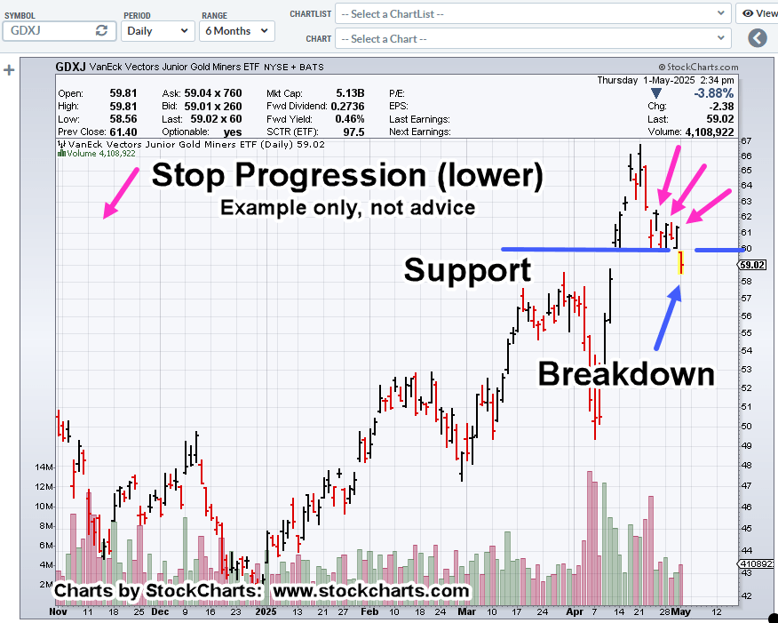 The chart shows how short position, JDST-25-10, is being managed. Lowering the stop (higher for JDST) in the direction of the trade (not advice, not a recommendation).