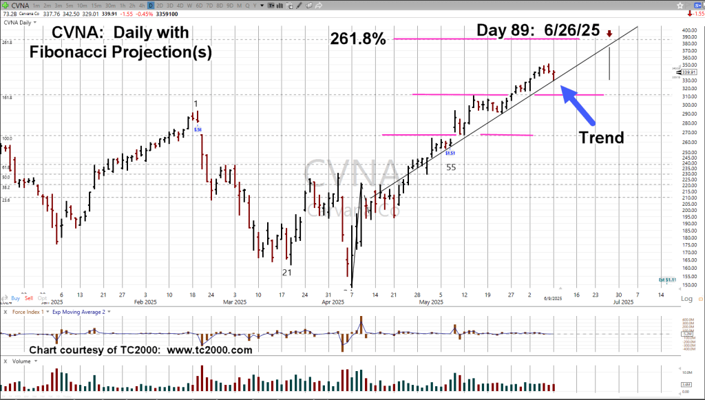 The last completed trade, CVNA-25-15, went short at 308.48, last Thursday; covered the next day at 289.25, for a modest gain of 6.7%.