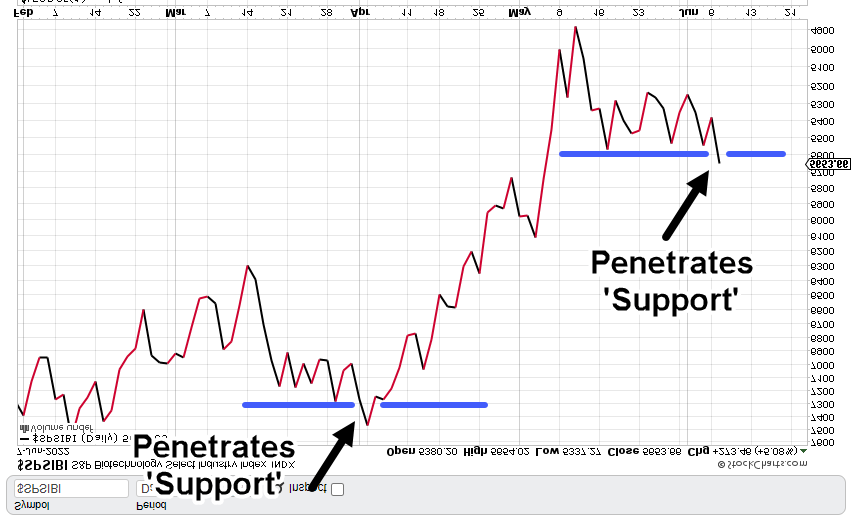 Of the two indices being tracked, IBB and SPBIO, the latter of the two, is the weakest.
