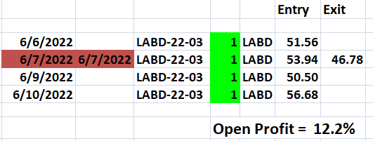 The data below is taken from one of the accounts trading this market. It’s provided as a courtesy; showing entries and exits as the trade, LABD-22-03, unfolds (not advice, not a recommendation).