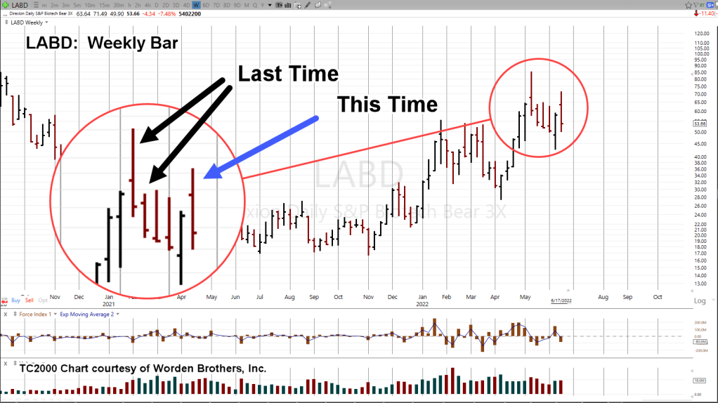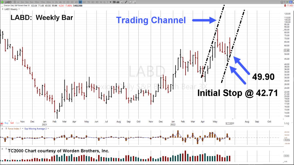The weekly chart shows progression and location of the stop orders on LABD-22-03 (not advice, not a recommendation).