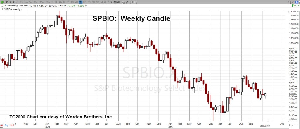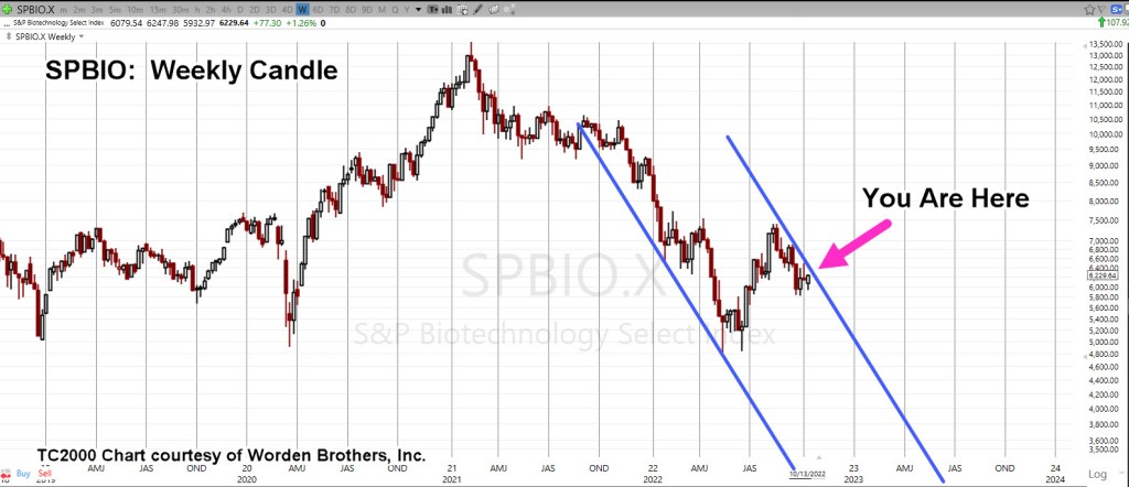 We’ve taken the weekly closing chart of SPBIO ($SPSIBI, on StockCharts) and inverted it to mimic the action of inverse fund LABD.