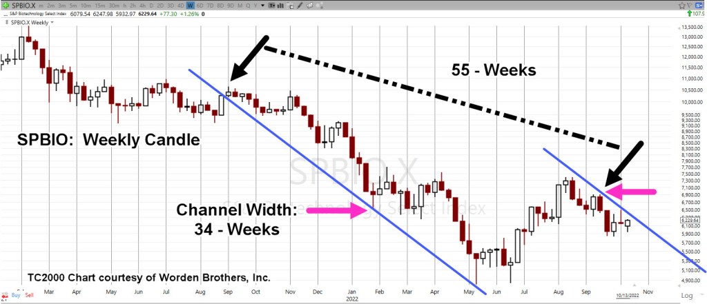 Channel width measured from week ending 1/28/22, to the same contact-point, week ending 9/16/22, is a Fibonacci 34-Weeks.