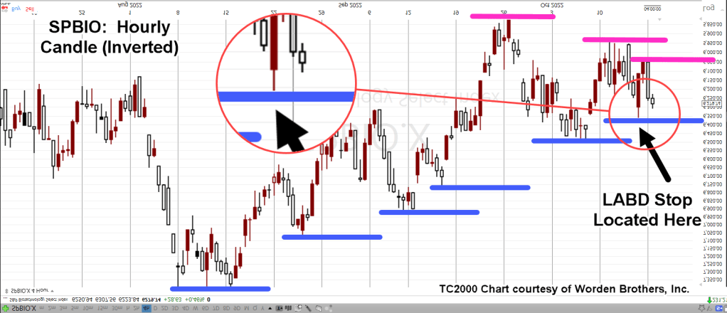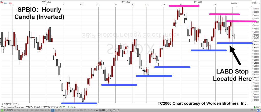 Once again, we’ll use an inverted chart of SPBIO to mimic the action of leveraged inverse fund LABD.