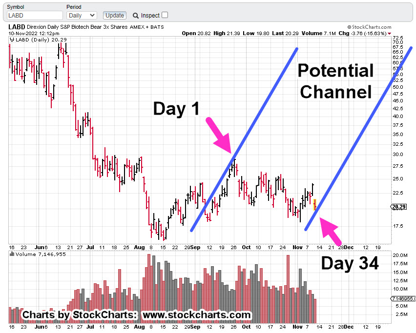 However, as we’ll see below, the leveraged inverse fund LABD, could be completing its reversal set-up.