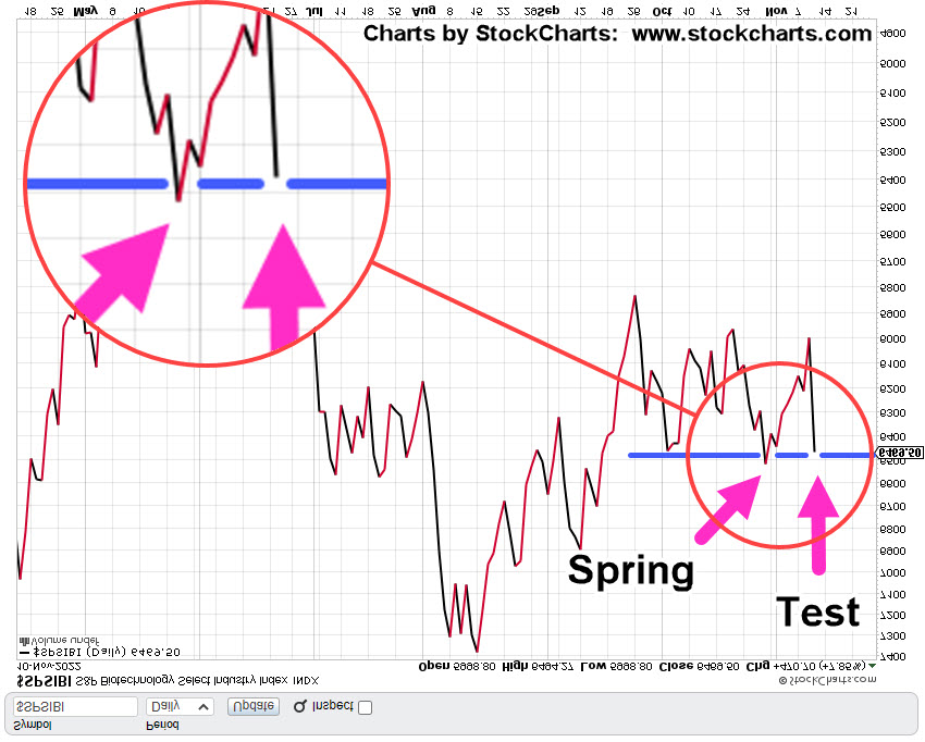Another reason to think we’re completing a test of the spring, is below. Today is Fibonacci Day 34, from the high (low on SPBIO), set on September 26th.