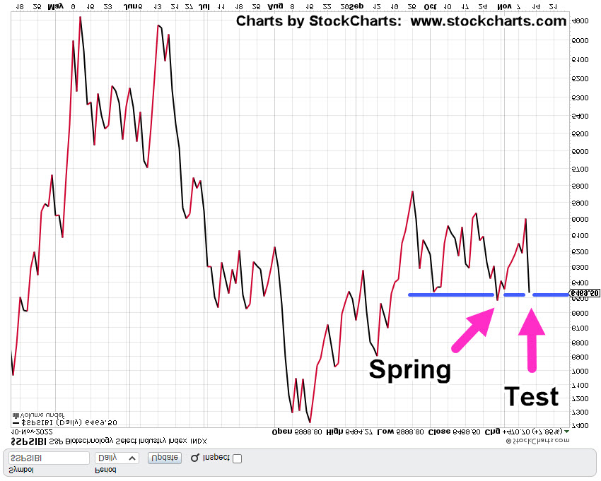 When looking at biotech sector (SPBIO) on a close basis, today’s action stopped just short of making a new closing high since the up-thrust (reversal) of October 28th.