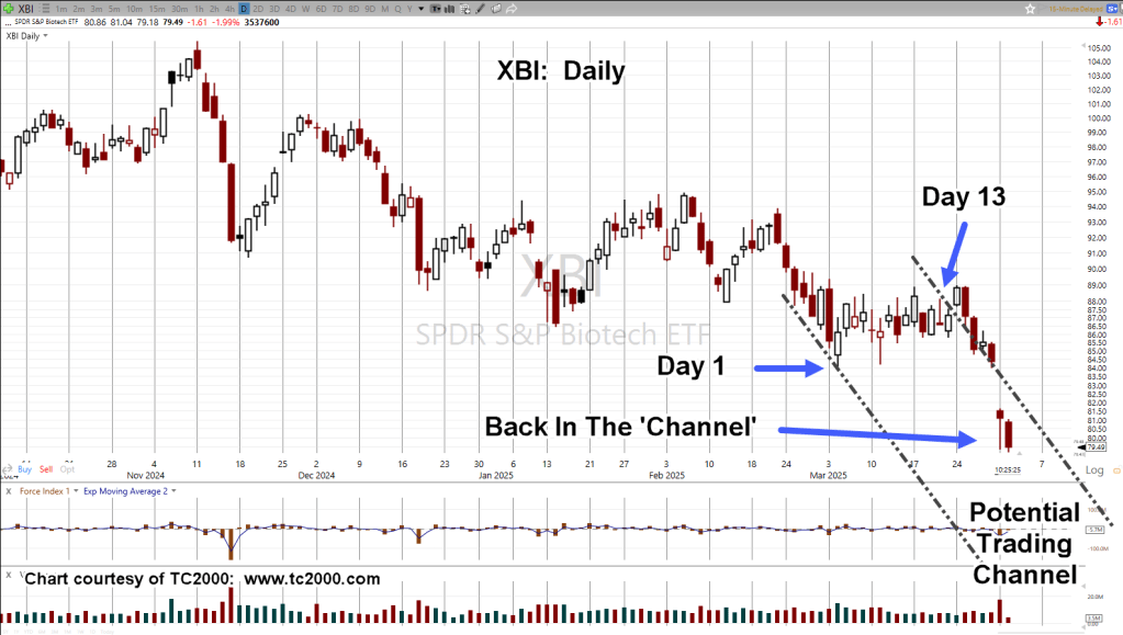 While the market is hysterical, price action in XBI, indicates the current down move is losing (some) energy, hence the reason for the exit.