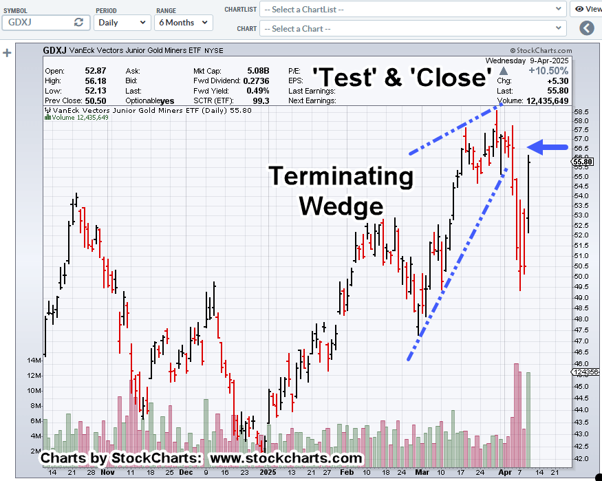 Even though both gold (GLD), and silver (SLV), are trading lower as of this post (12:52 p.m., EST), the Junior Miners GDXJ, posted a new daily high, thus, short JDST-25-09, was exited (not advice, not a recommendation).
