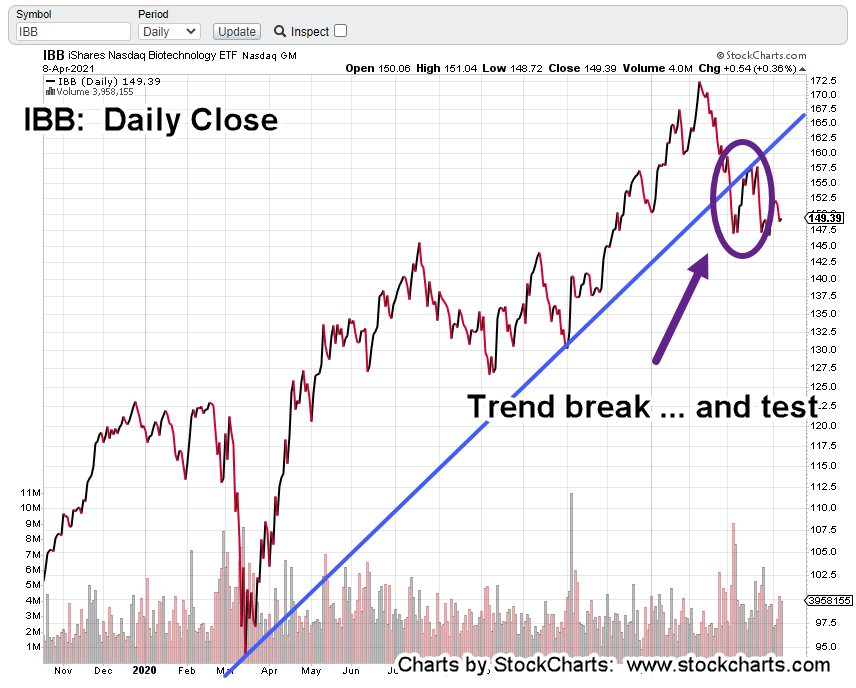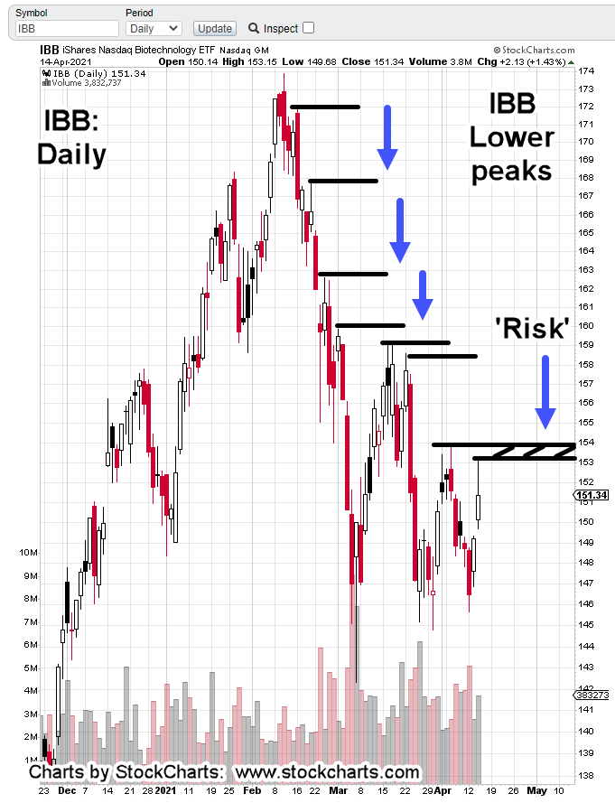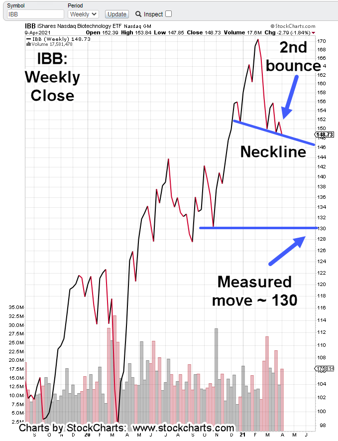 There is one caveat: As of this post, IBB has not printed a new daily low. That leaves the (slight) possibility open for a move higher.