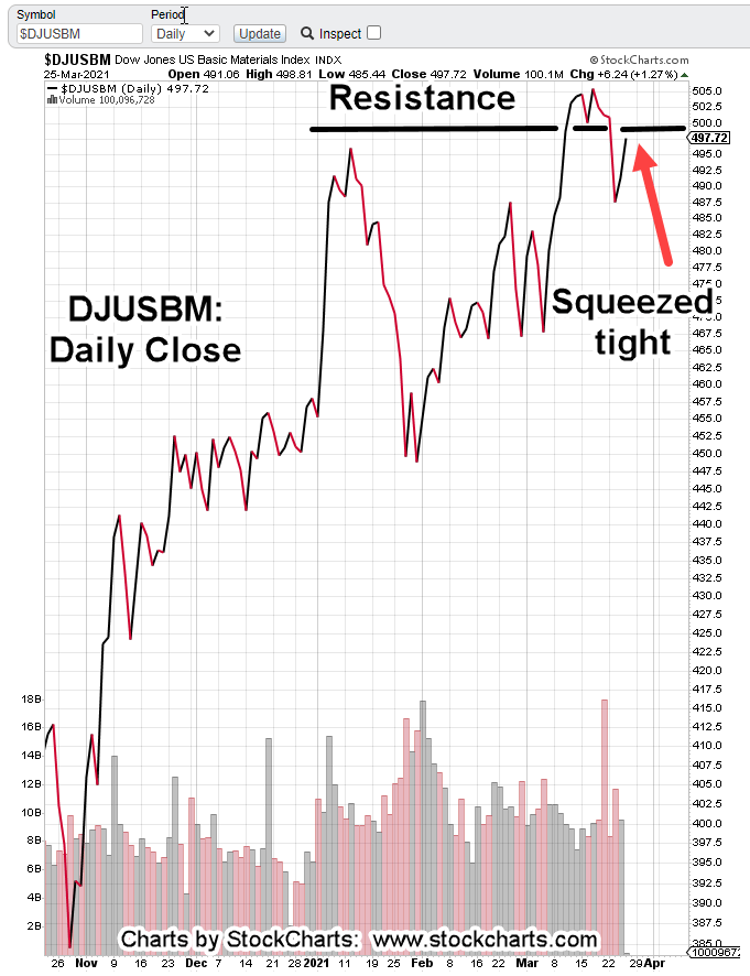 That upward bias may also lift the Basic Materials Sector (DJUSBM) and possibly offer a low risk short position via SMN (not advice, not a recommendation)