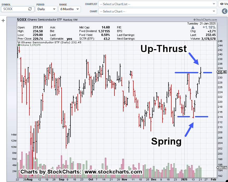 In effect, Wyckoff analysis gave us a ‘head’s up’ nearly a week ago, the SOXX may be about to reverse.