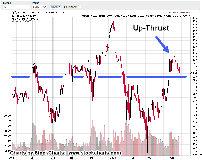 The daily chart shows IYR, oscillating around an axis, support/resistance line; struggling to move higher (in up-thrust condition) with no real progress.
