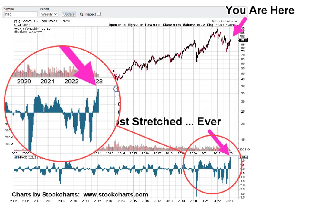 As with bonds in the April 3rd, update, we’re at the danger point with IYR.