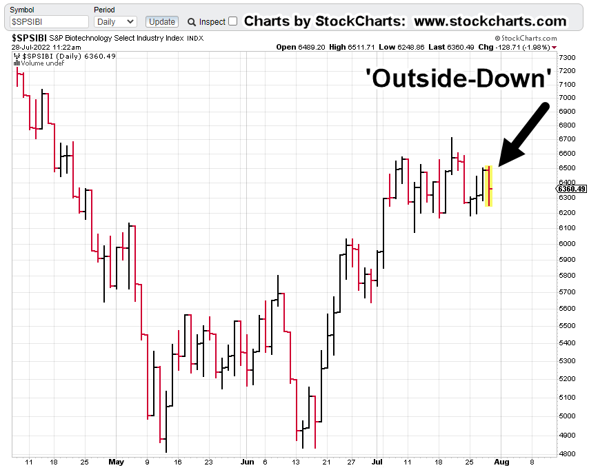 Contrast the reversal of index SPBIO, at – 7.04%, with S&P (SPY) at – 1.16%, and the market itself is telling us where to go for opportunity (not advice, not a recommendation).