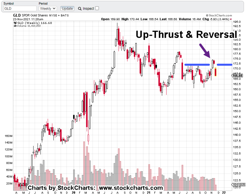 The chart reviews the recent up-thrust (reversal) that was accompanied by hysterical … bordering on unhinged insane press coverage of an imminent break higher.