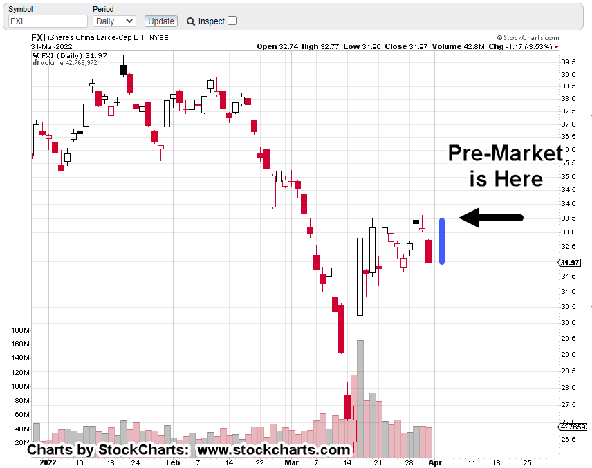 The daily chart of FXI below has pre-market action as the blue line.